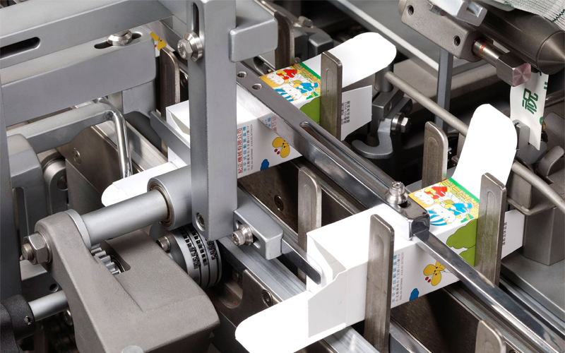 自動裝盒機(jī)進(jìn)料一般分為三個入口:說明書入口、藥瓶入口和機(jī)包盒入口。從機(jī)包盒進(jìn)料到最后包裝成型的整個過程大致可以分成四個階段:下盒、打開、裝填、合蓋。下盒動作通常是由一個吸盤從紙盒進(jìn)料口吸取一個紙盒,下行到裝盒的主線上,由一個導(dǎo)軌卡位將紙盒固定并用一個推板打開紙盒,同時會有兩個可向前移動的卡位從下面升起,從前后方向卡住紙盒的側(cè)面,使盒子打開成直角并前移到裝填區(qū)域。 在裝填區(qū)域填裝后,機(jī)器的機(jī)構(gòu)會將耳朵折進(jìn)左右的導(dǎo)軌中,然后再進(jìn)行合蓋動作。合蓋前機(jī)構(gòu)會先彎折紙盒的插舌,然后有一推板推動盒蓋彎折,使插舌插進(jìn)盒子 中并使鎖扣扣緊。合蓋動作是個關(guān)鍵性的動作,完成的好壞與紙盒的結(jié)構(gòu)和機(jī)器調(diào)節(jié)的準(zhǔn)確程度有很大關(guān)系。
